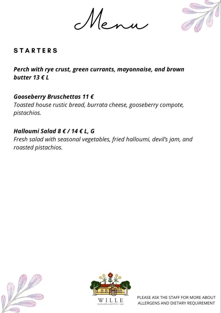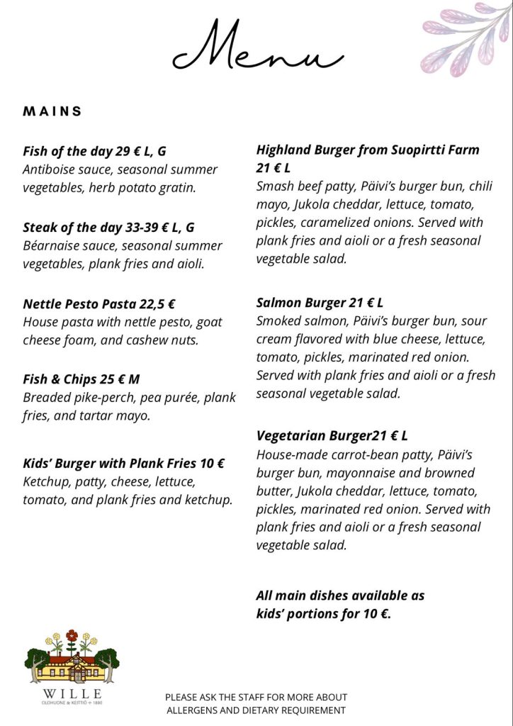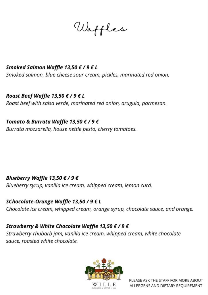 We are a delightful and atmospheric restaurant-café in the most beautiful wooden house in the very center of Äänekoski. We are open at the end of the week as an evening restaurant when a la carte delicacies are available. In addition, the popular Wille’s Waffle buffet on saturdays. On festive days , such as May Day and Mother’s Day, wonderful table settings. And in the summer we have a sunny terrace.